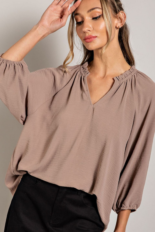 Blouse top with 3/4 puff sleeves and ruffled collar