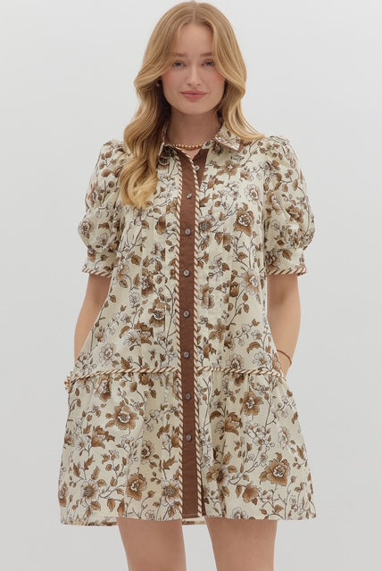 Floral print cuff band short puff sleeve ruffle hem mini dress
