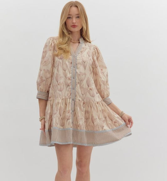 Floral print cuff band 3/4 sleeve ruffle hem mini dress