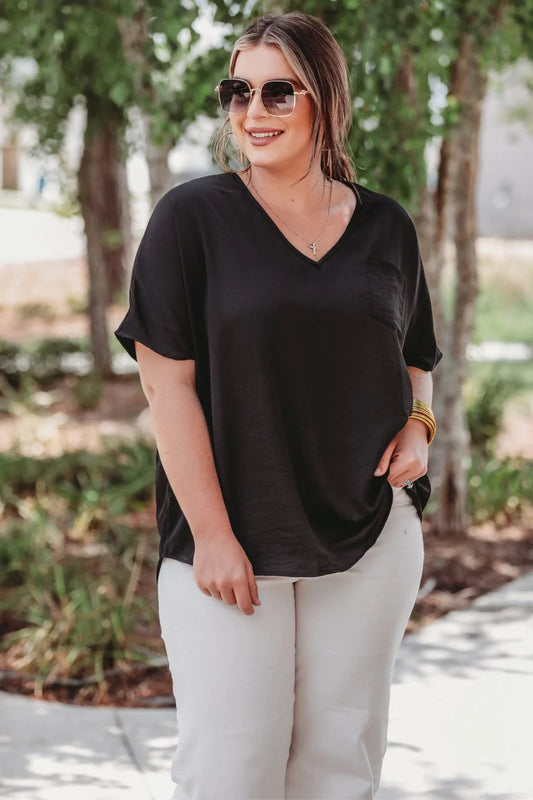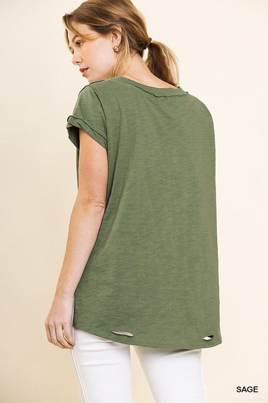 Gathered Short Sleeve V-Neck Knit Top with a Distressed Hem and Side Slits