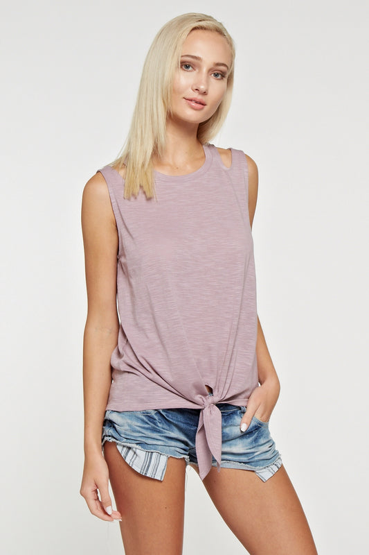 Slub knit fabric top with shoulder cutouts and front self-tie knot