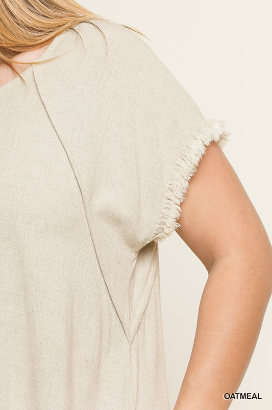 Umgee linen round-neck pocket dress with fringe short sleeves and high-low hem