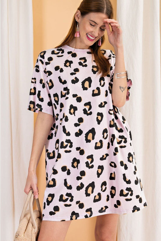 Short sleeves animal print washed oversized knit tee dress - Washed Leopard Tunic Tee Dress