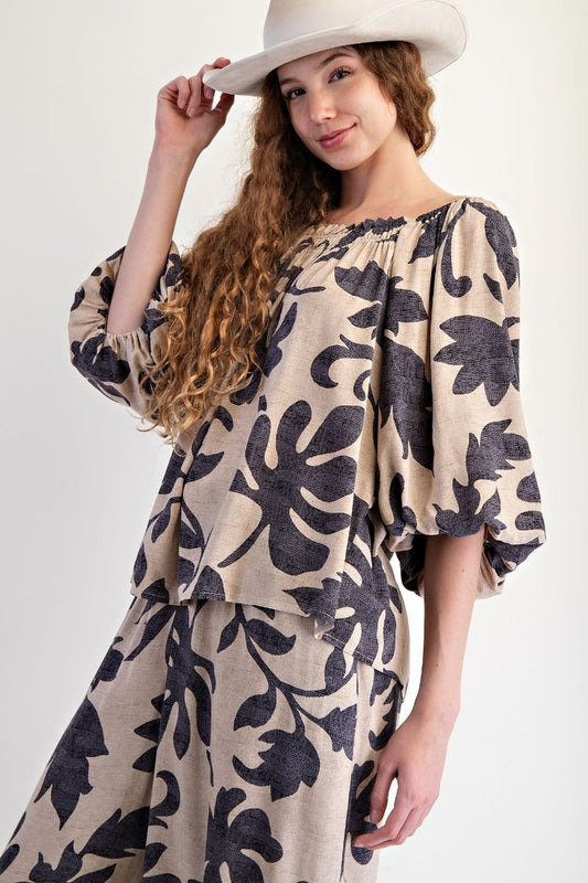 Bubble sleeves printed rayon challis top with elasticized neckline