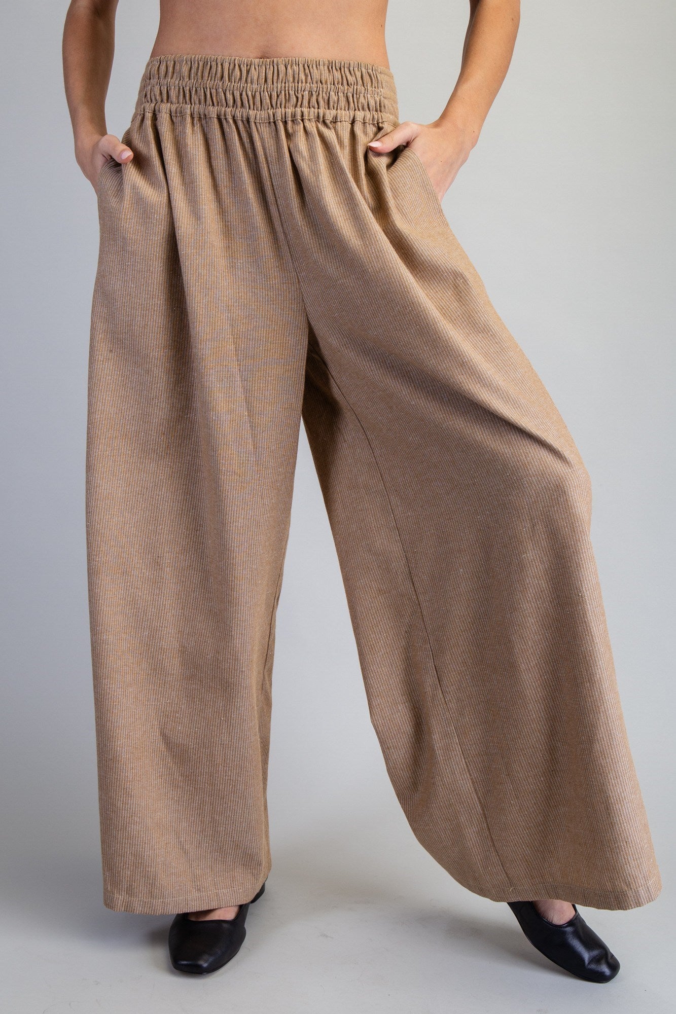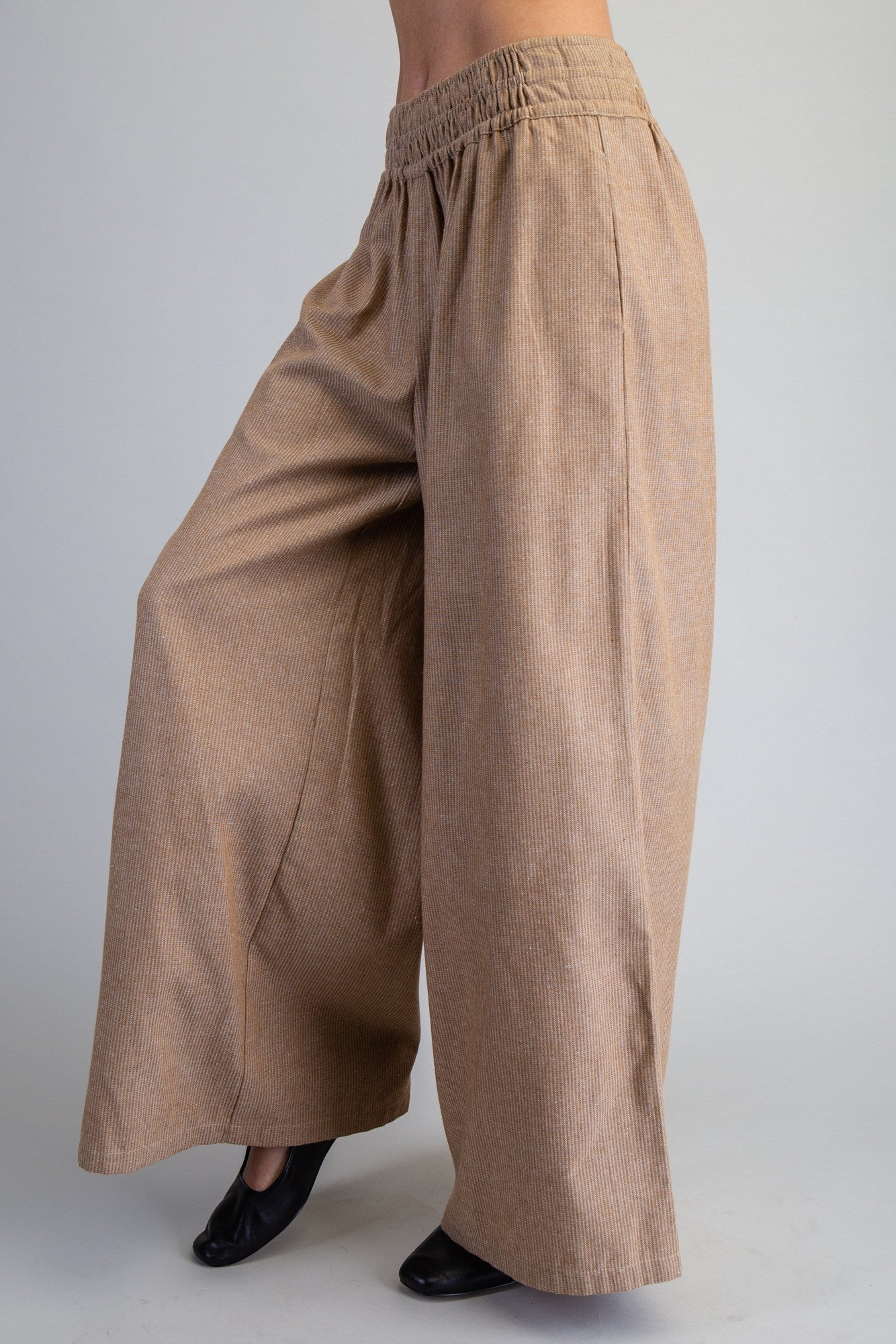 Effortlessly chic and endlessly comfortable, these wide leg pants bring sophistication to everyday dressing. Designed with a subtle pinstripe pattern and a full-length fluid drape, they strike the perfect balance between polish and ease. The elasticized smocked waistband provides a flattering and flexible fit, while side hip pockets add a touch of laid-back practicality. Their relaxed, flowy silhouette moves gracefully from workday to weekend, making them a wardrobe essential for any season.