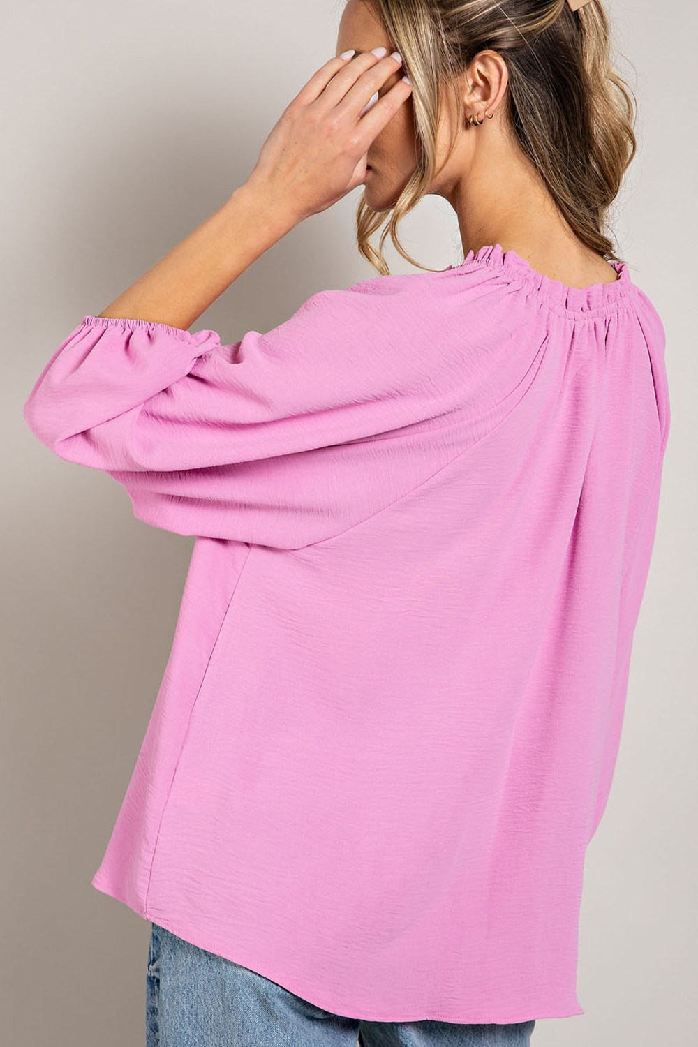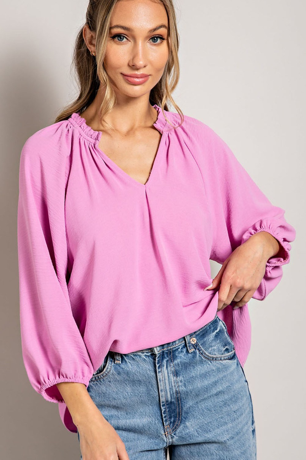 This best-selling Blouse top featuring 3/4 puff sleeves and a charming ruffled collar is a versatile piece that combines elegance and comfort, perfect for both casual outings and dressier occasions.