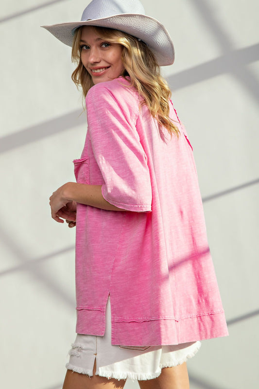 Linen Blend Color Block Gauze Button Up Short Folded Sleeve Top with Chest Pocket and Frayed Hemline
