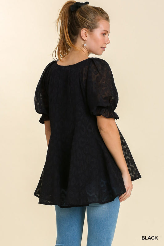 Leopard Print Puff Sleeve V-Neck Blouse with Lining
