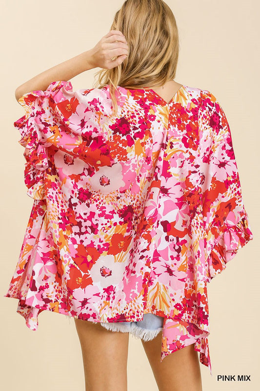 Floral Print Ruffle Sleeve Open Front Kimono with Side Slits