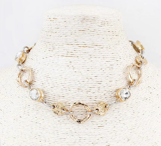 Gold and Silver Two Tone Textured Necklace with Clear Stone 16"-18" Necklace