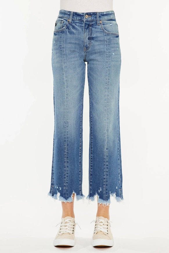 Elevate your denim collection with these Kan Can high-rise jeans, designed to offer both a timeless silhouette and modern edge. Featuring a beautiful medium wash and a trendy chewed hem, these jeans are the perfect blend of vintage-inspired style and contemporary detail.