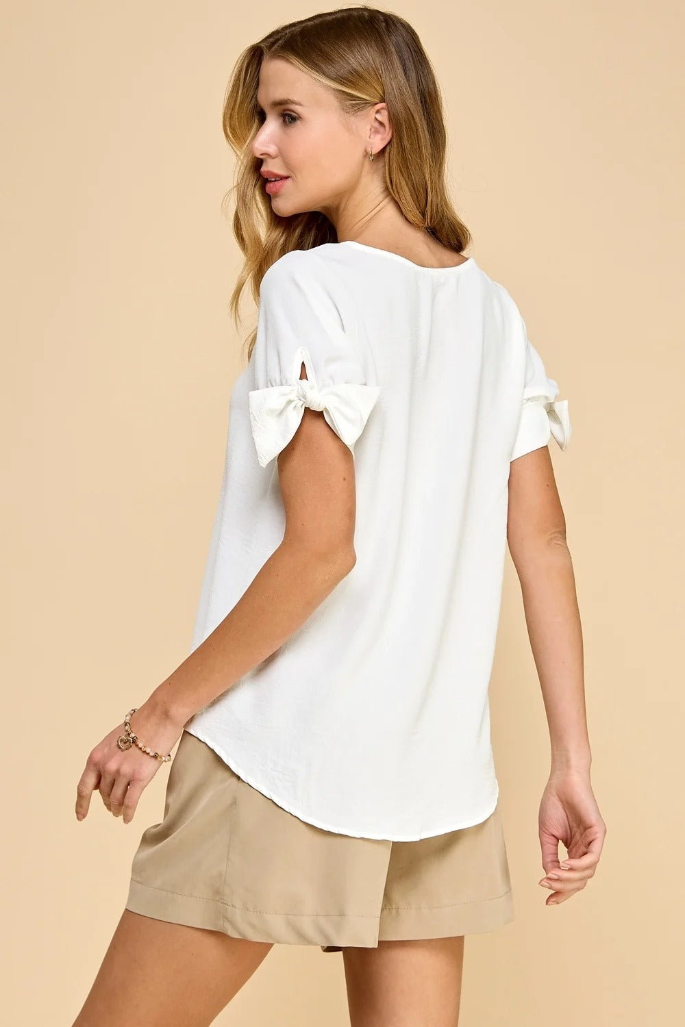 This chic solid top is designed with knot-detailed sleeves, adding a unique and stylish twist to a classic piece. The soft, comfortable fabric makes it perfect for all-day wear, while the knot accents bring a modern flair.