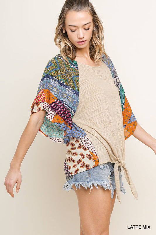 Mixed print round neck heathered knit top with layered ruffle sleeves and waist tie
