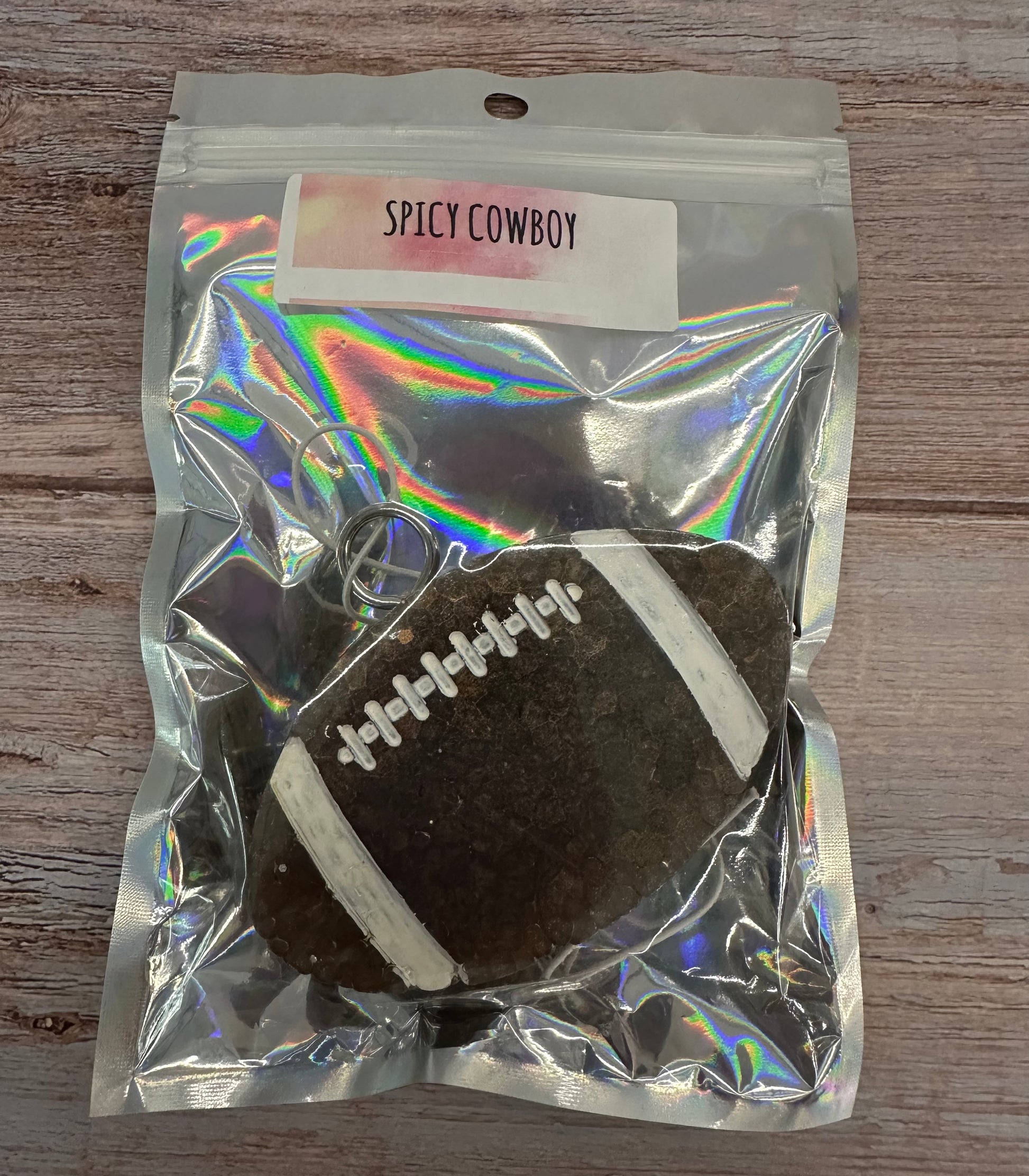 This Football Fall Freshie is the perfect accessory for sports enthusiasts and autumn lovers alike! This freshie is cleverly shaped like a football and comes equipped with a ring and string, making it easy to hang anywhere you desire. Infused with our captivating Spicy Cowboy fragrance, it offers a warm and invigorating aroma that embodies the spirit of fall. Whether you hang it in your car, locker, or home, the Football Fall Freshie is sure to be a winning addition to your seasonal decor.
