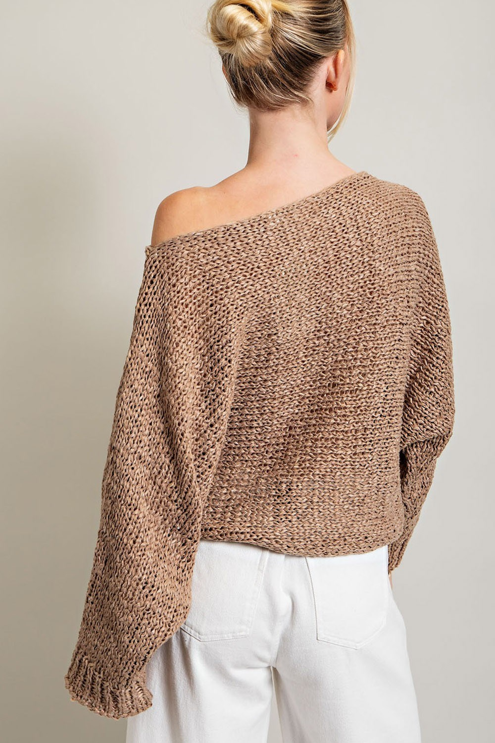 Solid long sleeve knit sweater top featuring a boat neckline for a cold shoulder effect and a relaxed and loose fit body. Pair with jeans for a casual outfit or style with a dress for more of a fancier look.